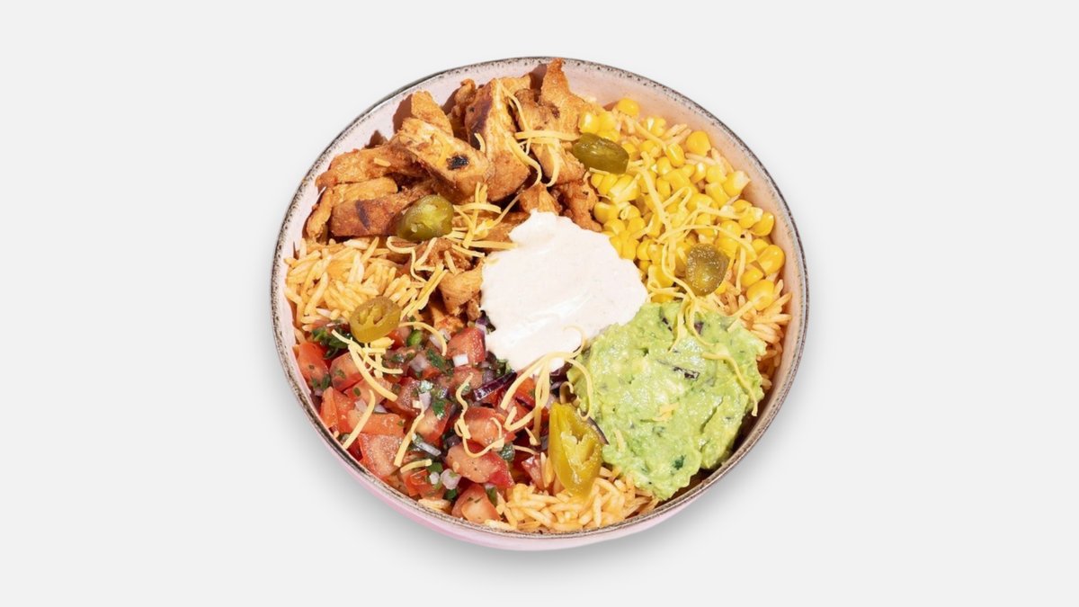 გრილზე შემწვარი ქათმის ხორცი, გვაკამოლე და ჩედარის ყველი, ბრინჯი და სიმინდი. დამატებულია მექსიკური სოუსი, პიკო დე გაიო და ჰალაპენიო აუთენტური მექსიკური გემოს მისაღებად. 410 გრამი.