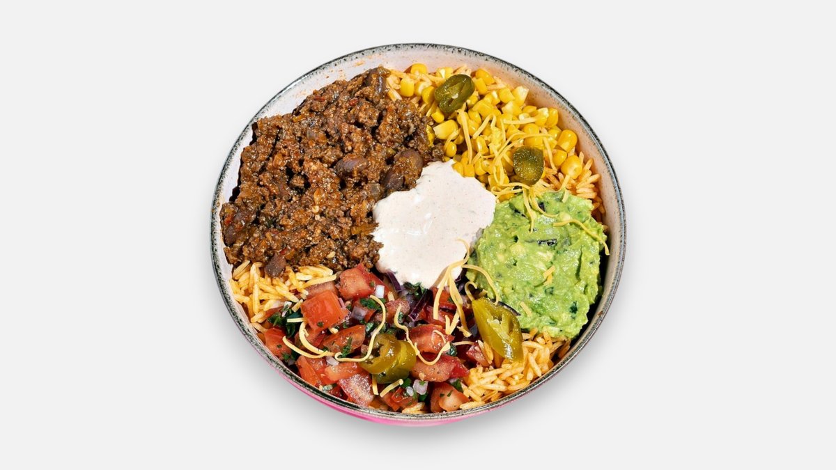 ნედლი საქონლის ხორცის ფარში, გვაკამოლე და ჩედარის ყველი, ბრინჯი, ლობიო და სიმინდი. დამატებულია მექსიკური სოუსი, პიკო დე გაიო და ჰალაპენიო აუთენტური მექსიკური გემოს მისაღებად. 410 გრამი.