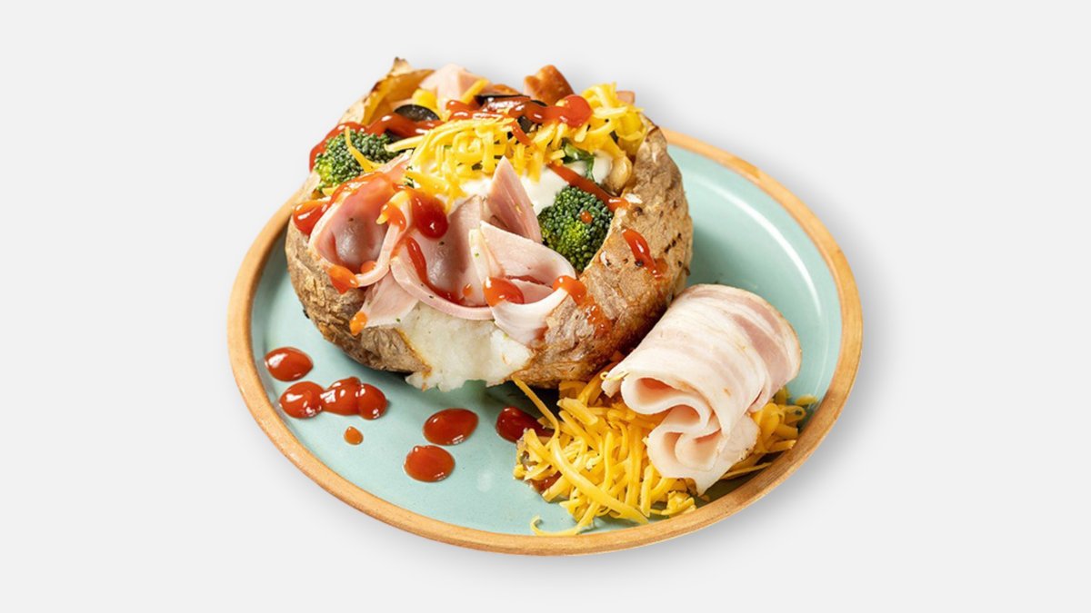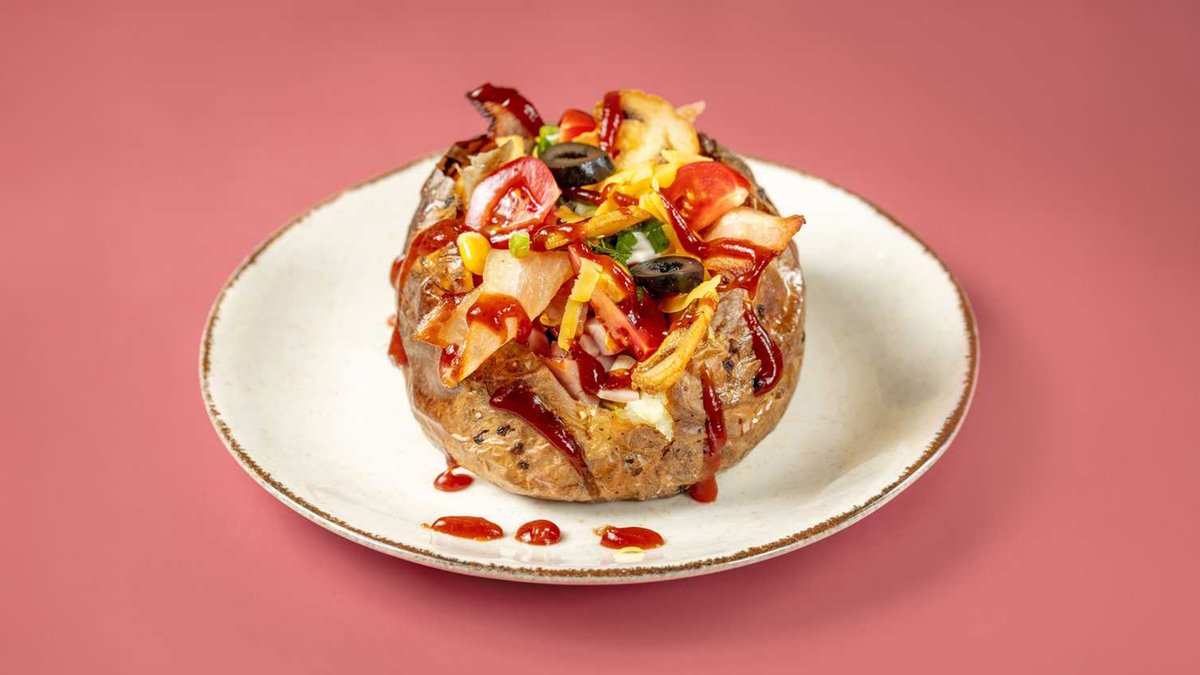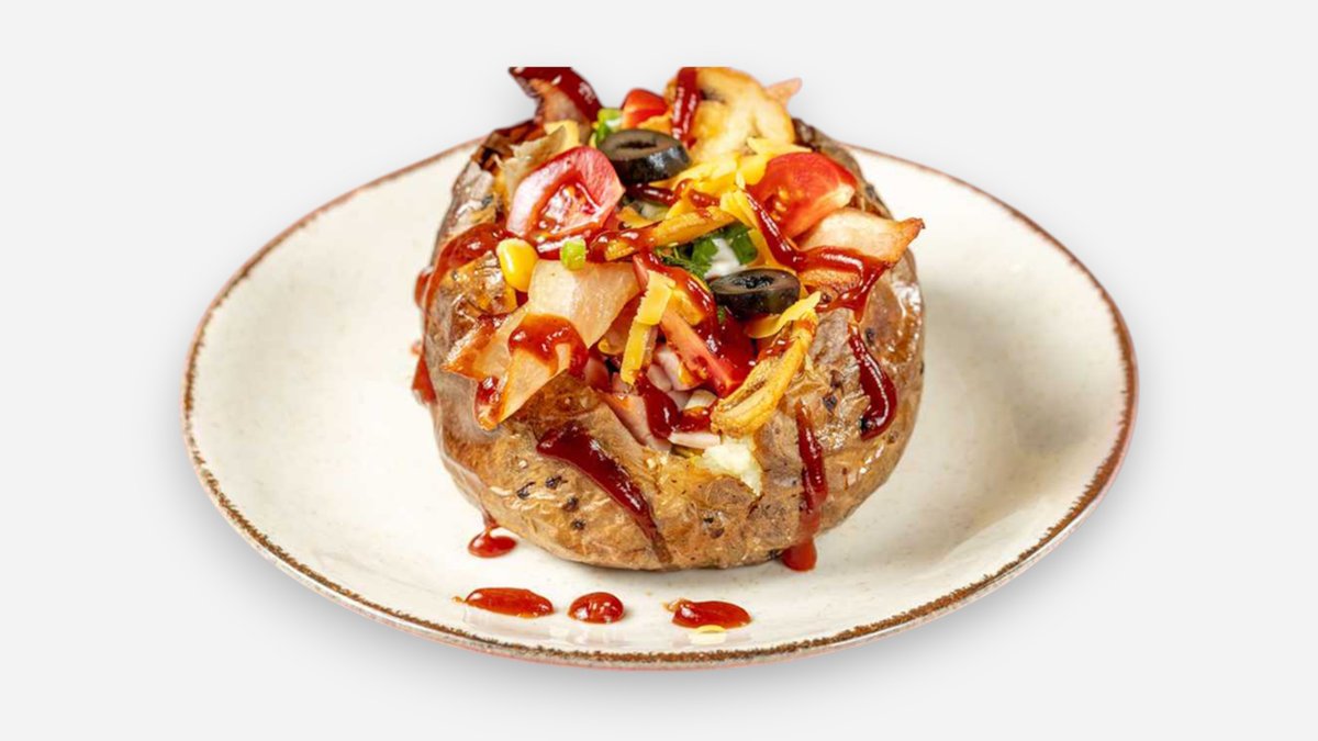 კარტოფილი კარაქით, შაშხი,ბეკონი, ჩედარი,სულგუნი ,მწვანე ხახვი,ზეთისხილი,ტკბილი სიმინდი, , პომიდვრის სოუსი