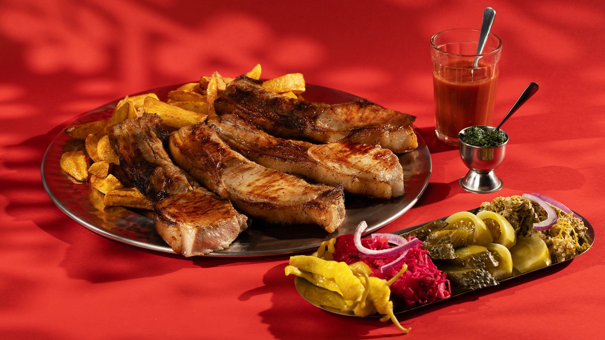 4 პორცია ნეკნი, მჟავის ასორტი, შემწვარი კარტოფილი, პომიდვრის საწებელი, ქინძის სოუსი - მენიუ 4 პერსონისთვის.