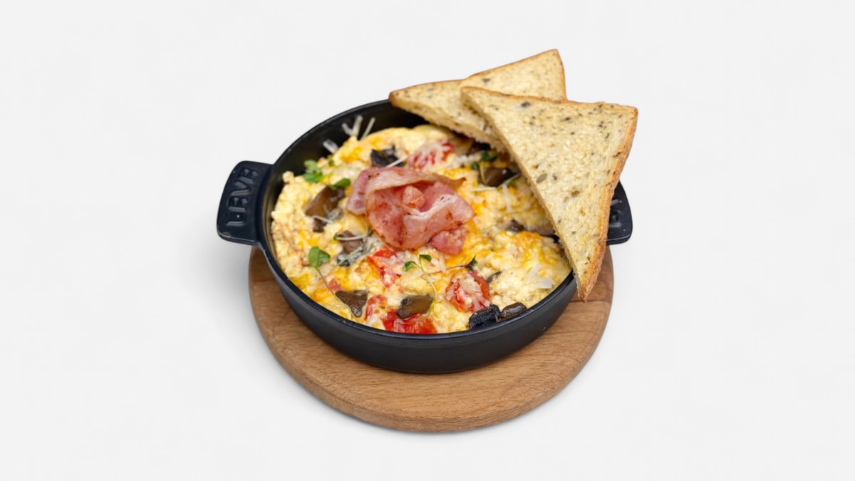 2 კრეპი, ქამა სოკო, ჩედარის ყველი, ისპანახი, ქონდარი.