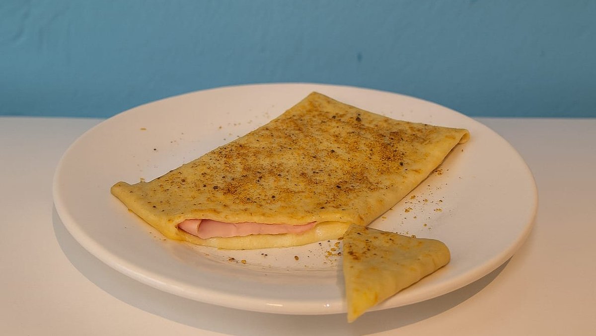 A warm, savory crepe filled with melted mozzarella cheese and slices of ham, a classic, satisfying combo with a sprinkle of thyme