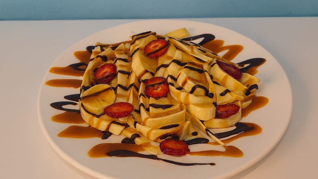A savory pasta crepe filled with Nutella, banana, and strawberries. A sweet twist on a crepe classic