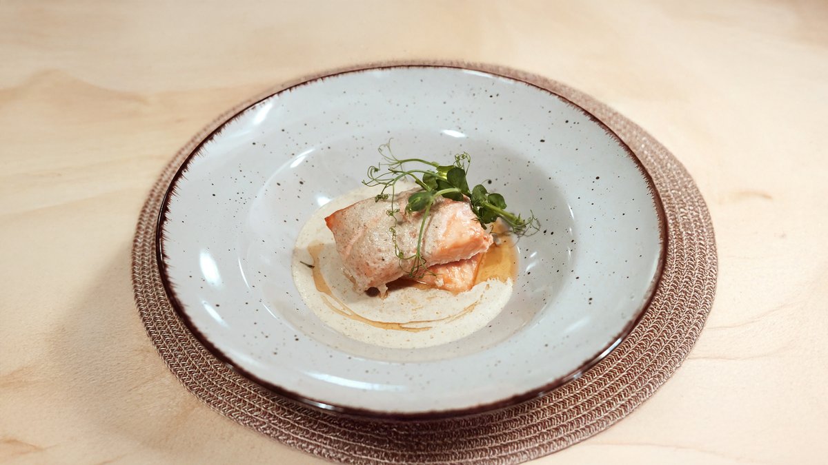სუ-ვიდში მომზადებული ქათმის მკერდი, ბადრიჯანი, ყაბაყი, წითელი ბულგარული წიწაკა, მზესუმზირის ზეთი, ბალზამიკო, რომესკოს სოუსი