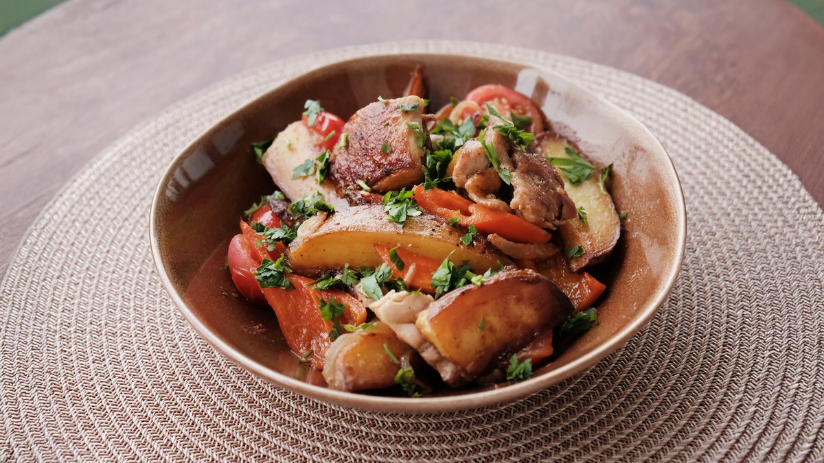 სუ-ვიდში მომზადებული ქათმის ბარკალი, კარტოფილი, ბულგარული წიწაკა, ჩერი პომიდორი, ნიორი, სვანური მარილი, ოხრახუში