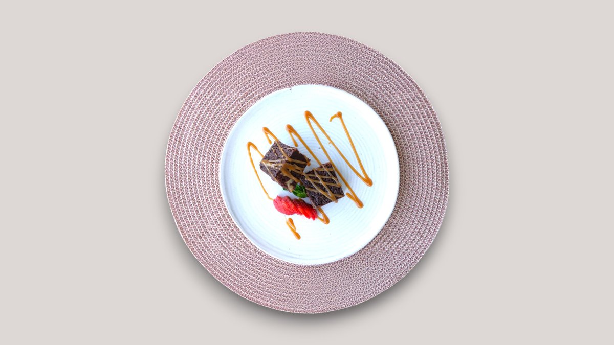 ბრაუნი 60%-იანი მწარე ბელგიური შოკოლადისგან, გამოკვეთილი შოკოლადის გემოთი, კარაქით, ლერწმის შაქრითა და ნიგვზით.