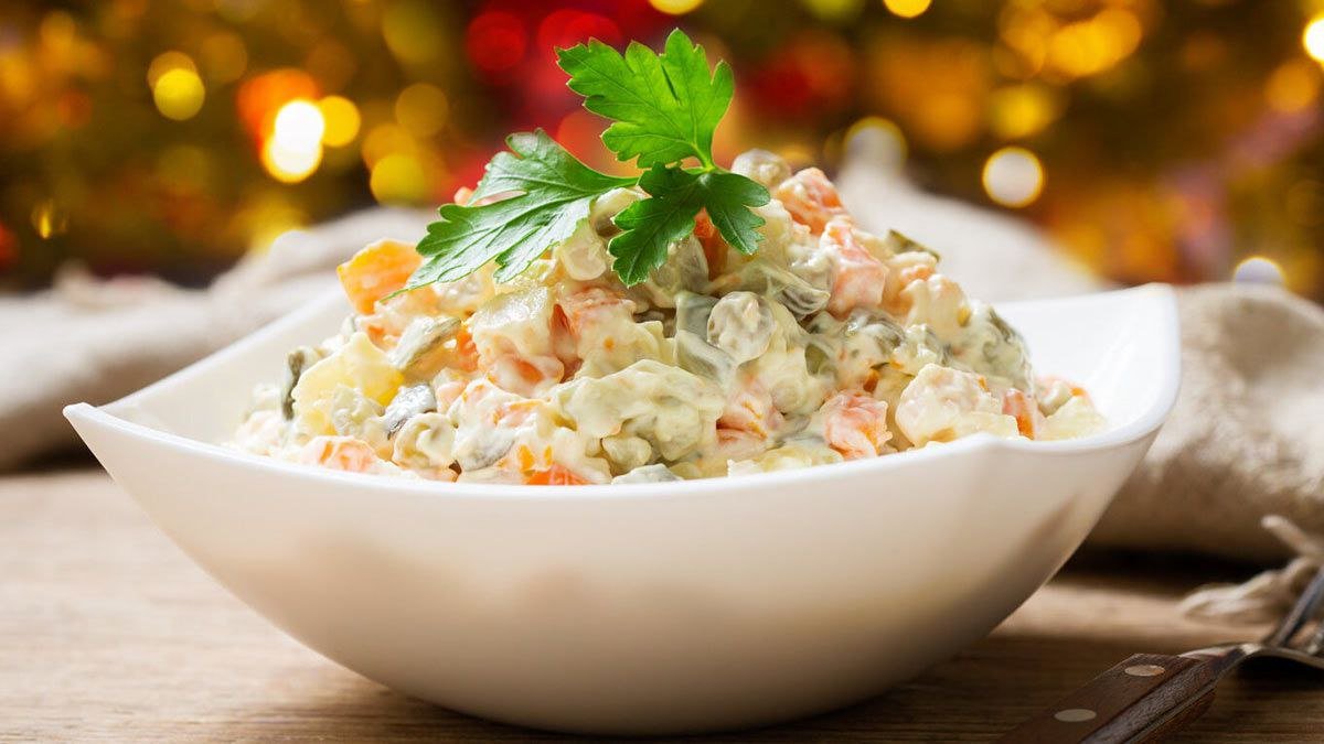 კარტოფილი, სტაფილო, კვერცხი, მჟავე კიტრი, მწვანე ბარდა, სუ-ვიდის მეთოდით მომზადებული ქათამი, მაიონეზი.