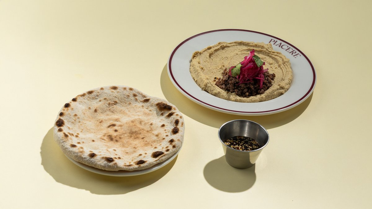Hummus, ground beef, chili oil, red onion and sumac salad, flatbread. (spicy)