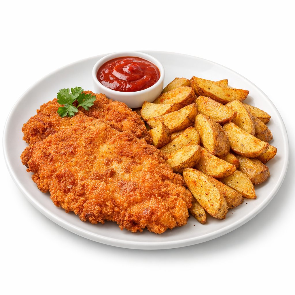 ხრაშუნა ქათმის შნიცელი პანირებული პანკოში შემწვარი ოჯახურ კარტოფილთან ერთად