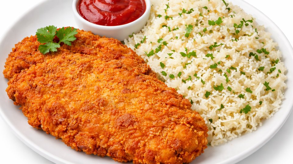 პანირებული წვნიანი ოქროსფერი ხრაშუნა ქათმის შნიცელი ბრინჯის გარნირით და სოუსით