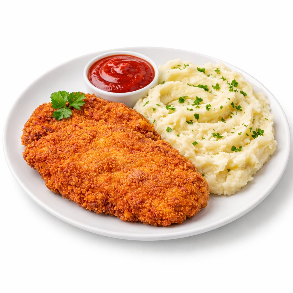 ხრაშუნა ოქროსფრად პანირებული წვნიანი ქათმის შნიცელი პიურეს გარნირთად ერთად