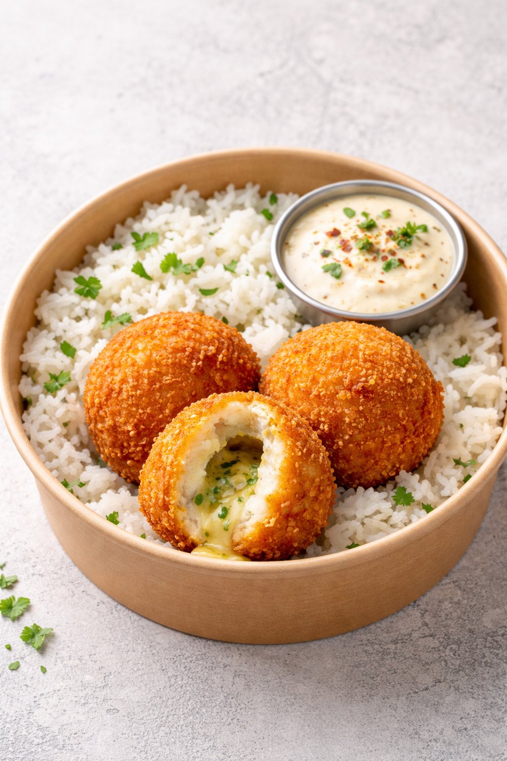 ხრაშუნა პანირებული კიევური კატლეტის ბურთულები ნივრის კამის და კარაქის შიგთავსით,გარნირად მოყვებას ბრინჯი და სოუსი თქვენი გემოვნებით