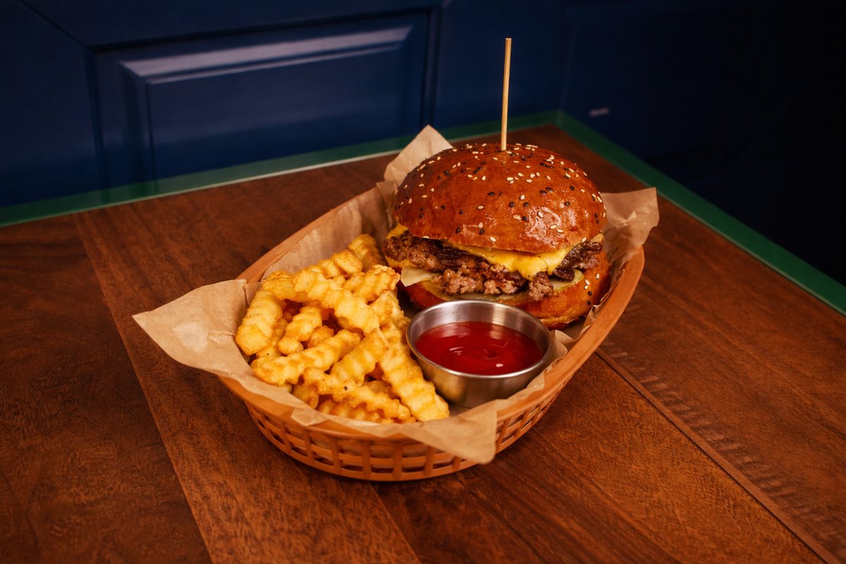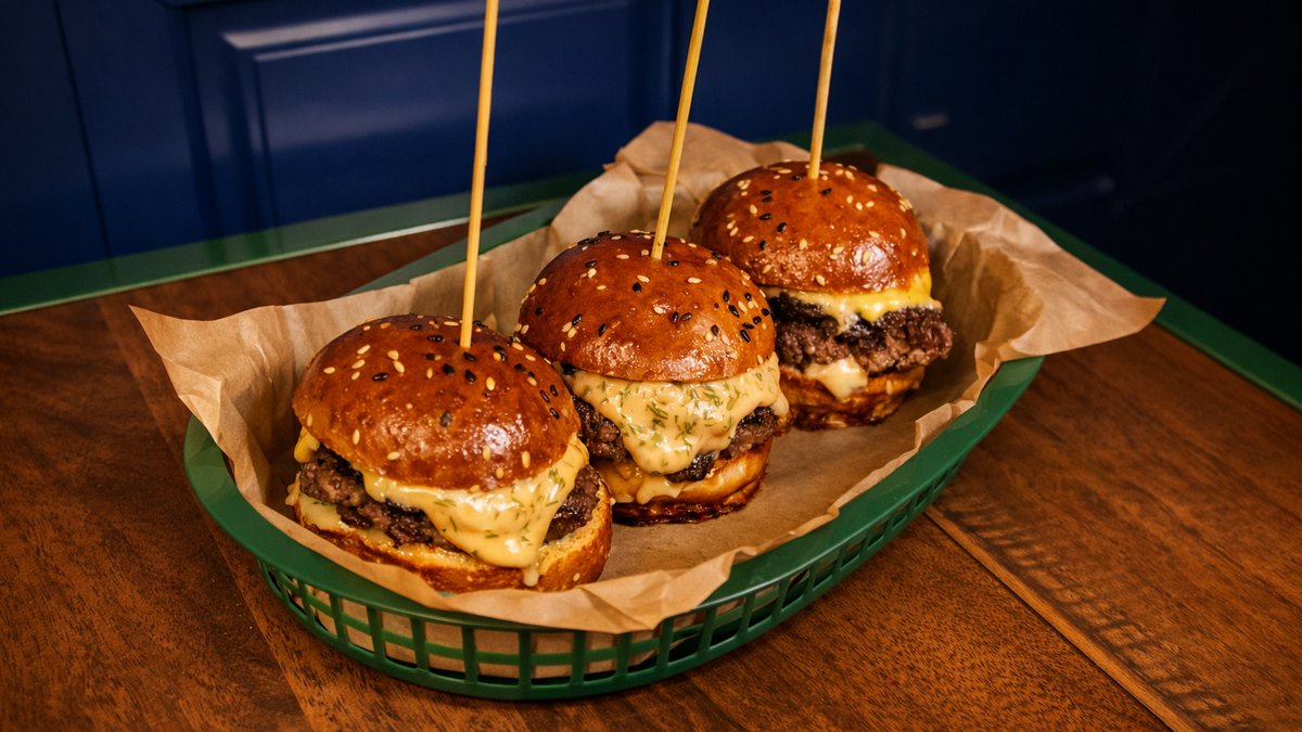 საფირმო მინი ბურგერი კარამელიზირებული ხახვით, ამერიკული ყველით და კიტრის მარინადით.