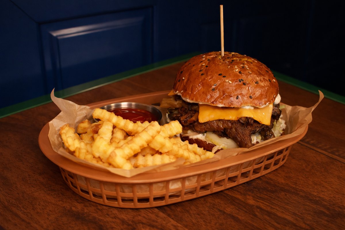 სოკოს ბურგერი ამერიკული ყველით, ტრუფელის მაიონეზით, აისბერგით და ფრით