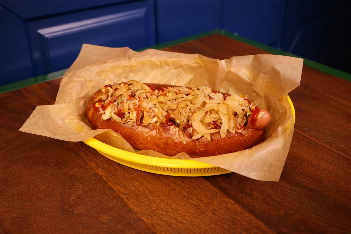 შებოლილი სოსისი, პური, ხრაშუნა ხახვი და თაფლიანი მდოგვი