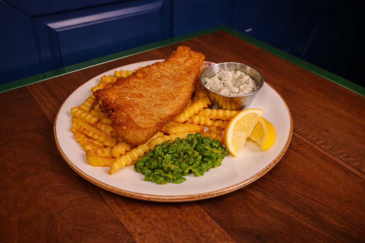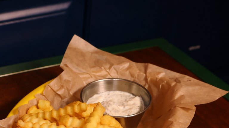 ტემპურაში შემწვარი თევზი ფრით, პიტნიანი ბარდით და ტარტარის სოუსით