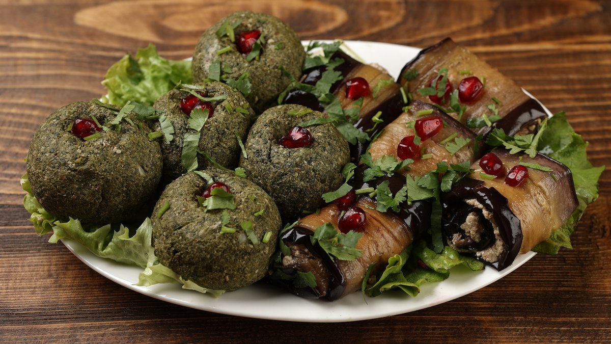 რეჰანი, ოხრახუში, ხახვი, ნიგოზი გატარებული, ზეთი, ძმარი