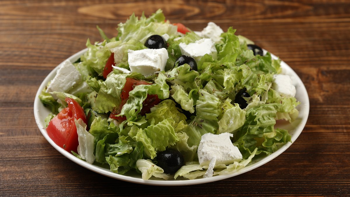 სალათის ფოთოლი, ყველი ფეტა, კიტრი, პომიდორი, წითელ ხახვი, ლიმნის წვენი, ზეთის ხილი, ბულგარული