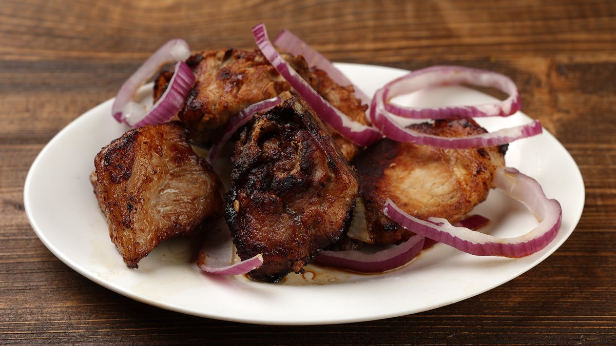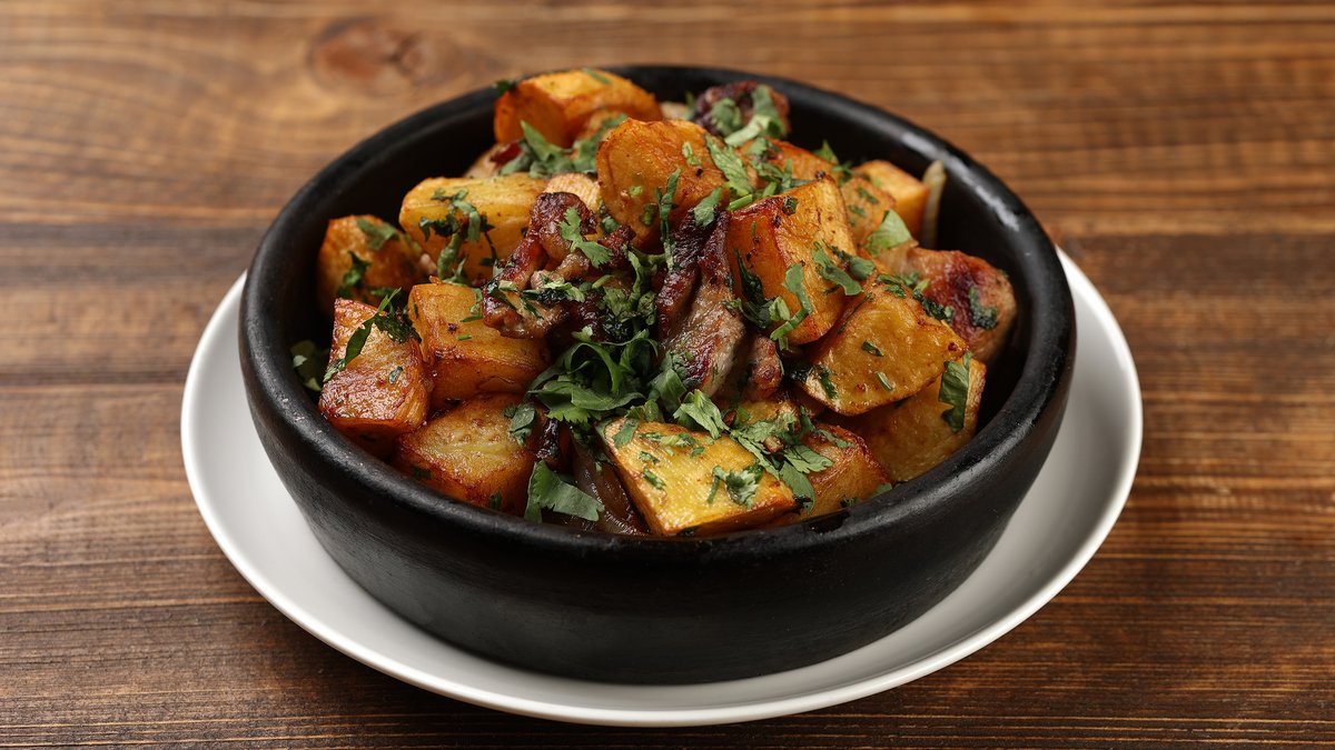 ღორის ხორცი, მარილი და პილპილი, კარტოფილი, ხახვი