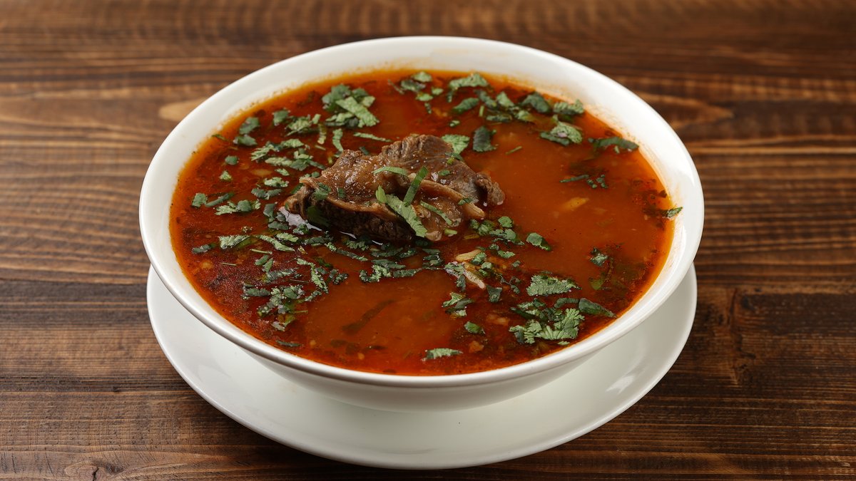 წითელი წიწაკა, მარილი, დაფნის ფოთოლი, ქინძი, ოხრახუში, ნიორი, პომიდორი, ხახვი, საქონლის ხორცი