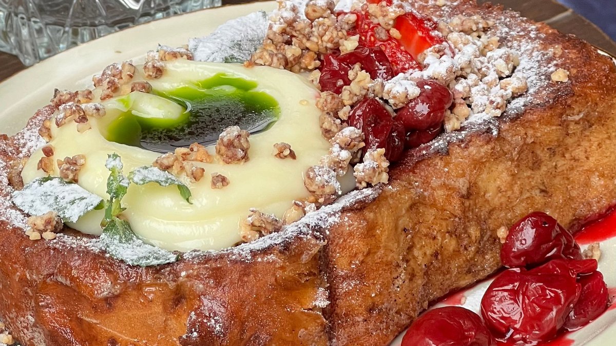 Brioche soaked egg and milk, matsoni cream, mint oil, nuts, berries, cinnamon