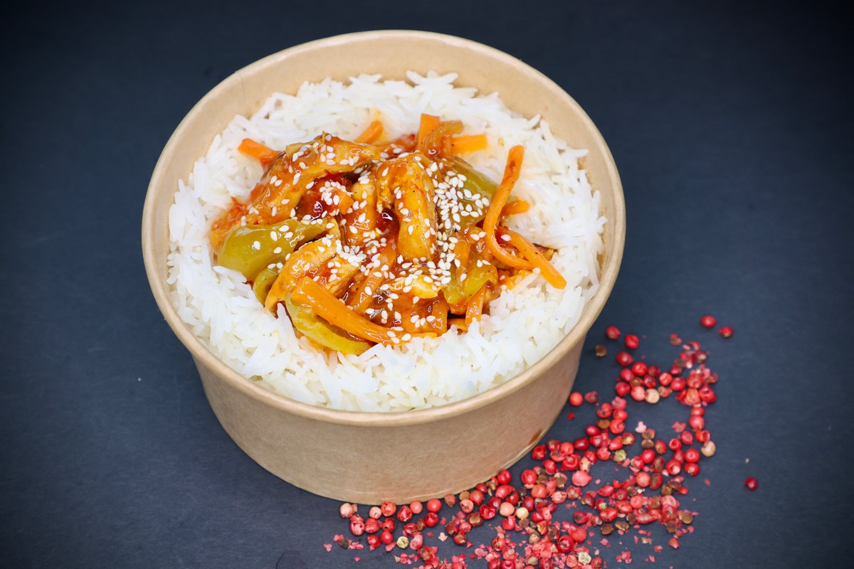 ქათამი ტკბილ-ცხარე სოუსში და ბრინჯი