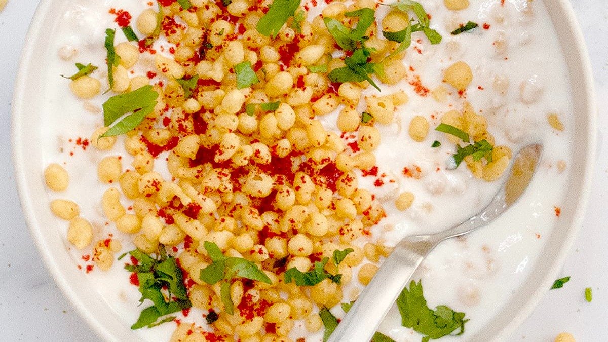 curd soaked with bundi, garnished with some dry spices, will be served in a dip container.