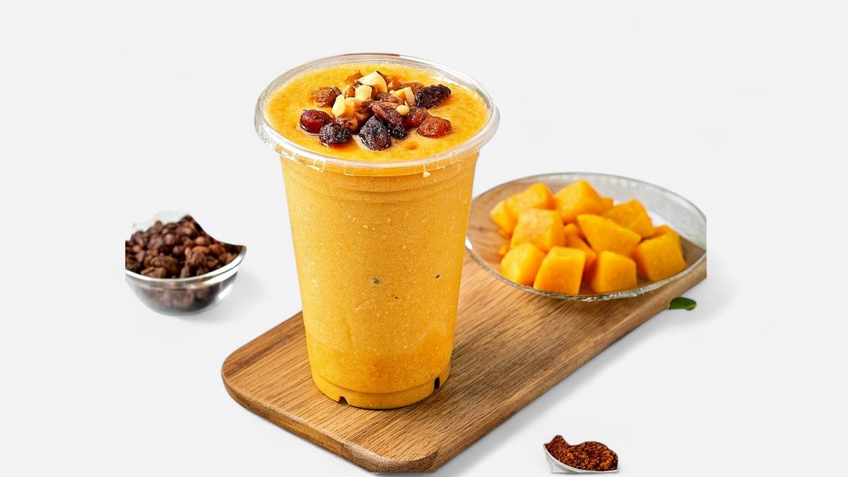 კრემისებრი მანგოს სასმელი დაქუცმაცებული ხმელი ხილის ნაზავით — ტკბილი და გრილი. Creamy mango drink with a mix of crushed dry fruits — sweet and refreshing