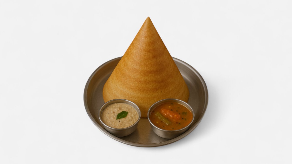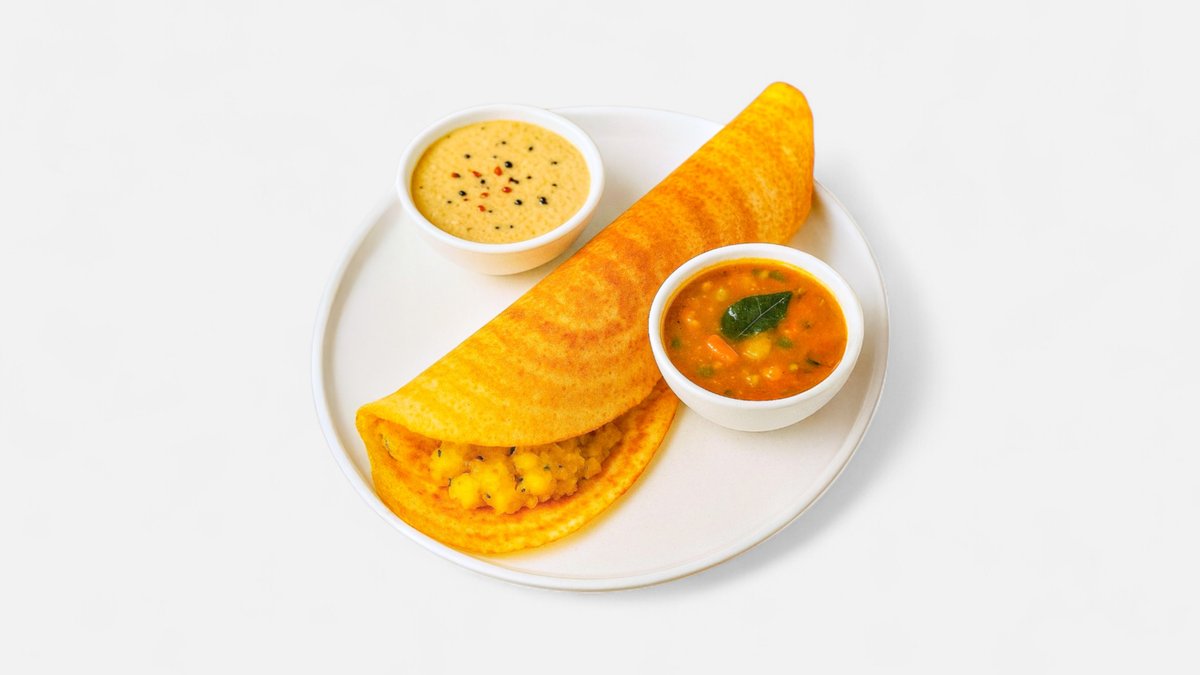 Masala Dosa is a beloved South Indian dish featuring a thin, crispy fermented rice-and-lentil crepe filled with a spiced potato masala. The golden-brown dosa is folded around a savory mix of mashed potatoes, onions, mustard seeds, curry leaves, and turmeric. Served hot with sides like coconut or peanut chutney and tangy sambar, this flavorful and satisfying meal is a perfect blend of crispy texture and warm, mildly spiced filling—ideal for any time of the day. მასალა დოსა სამხრეთ ინდური საყვარელი კერძია, რომელიც შედგება თხელი, ხრაშუნა ფერმენტირებული ბრინჯისა და ოსპის კრეპისგან, რომელიც სავსეა სანელებლებიანი კარტოფილის მასალათი. ოქროსფერ-ყავისფერი დოსა კარტოფილის პიურეს, ხახვის, მდოგვის თესლის, კარის ფოთლებისა და კურკუმას არომატული ნაზავის გარშემოა შემოხვეული. ცხელი მირთმევისას, ქოქოსის ან არაქისის ჩატნისა და მჟავე სამბარის მსგავს გარნირებთან ერთად, ეს არომატული და დამაკმაყოფილებელი კერძი ხრაშუნა ტექსტურისა და თბილი, მსუბუქად სანელებლებიანი შიგთავსის იდეალური ნაზავია - იდეალურია დღის ნებისმიერ მონაკვეთში.