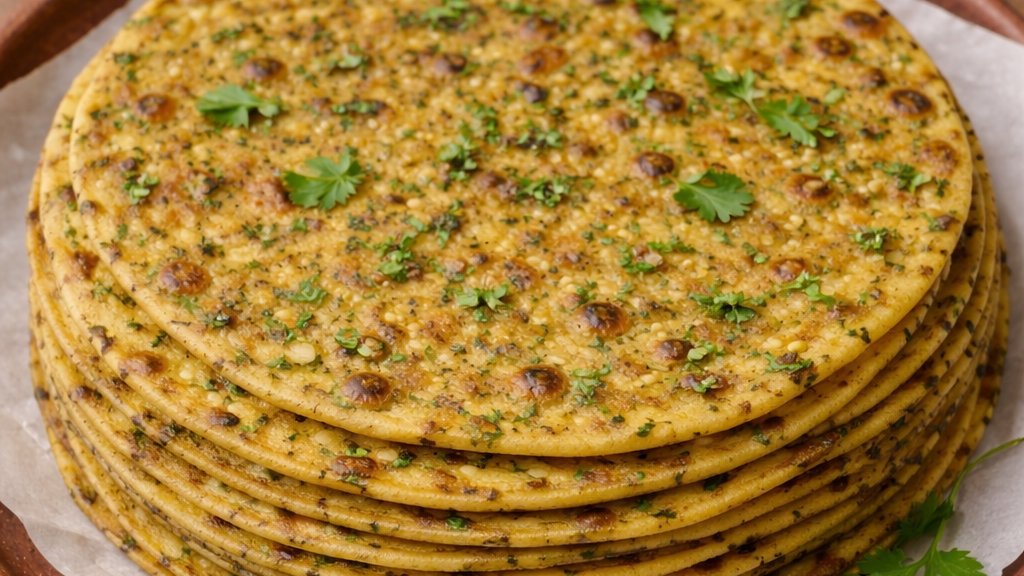 Thepla is a popular traditional Gujarati flatbread known for its thin, soft, and slightly crisp texture. It is made from whole wheat and gram flour mixed with spices such as turmeric, red chili powder, cumin, and coriander, often enriched with fenugreek (methi) leaves for a distinctive aroma and flavor. Theplas are mildly spiced, savory, and remain soft for long hours, making them ideal for travel and tiffins. They are commonly served with curd (yogurt), pickle, chutney, or a little butter on top. Nutritious, flavorful, and versatile, thepla is enjoyed as breakfast, lunch, or a snack across Gujarat and beyond.