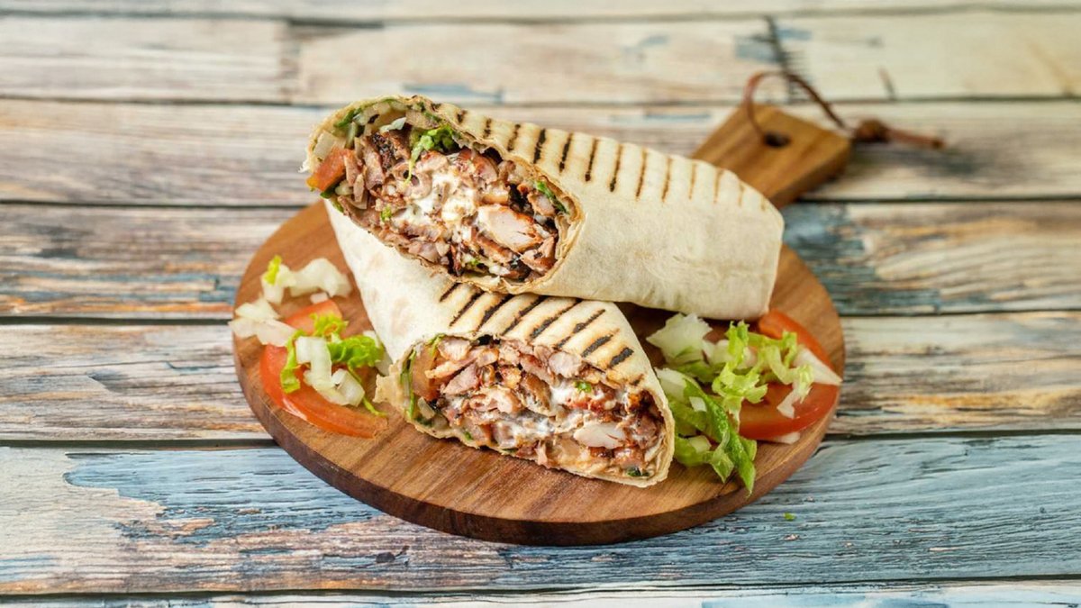 ლავაში, ქათმის ხორცი და ღორის ხორცი,სალათის ფოთოლი, ხახვი პომიდორი, წიწაკა, კეჩუპი, მაიონეზი