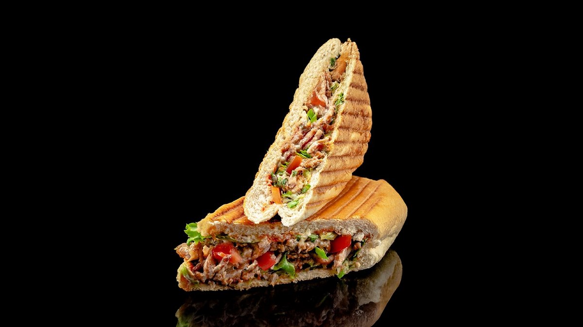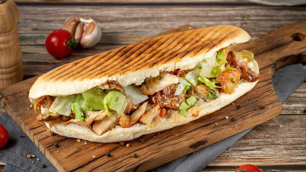 პური, ქათმის ხორცი და ღორის ხორცი,სალათის ფოთოლი, ხახვი პომიდორი, წიწაკა, კეჩუპი, მაიონეზი