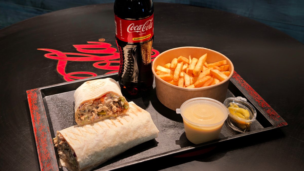 სტანდარტი შაურმა ქათმის ან ღორის, კარტოფილი ფრი, კეტჩუპი, ყველის სოუსი, წიწაკა და გაზიანი სასმელი