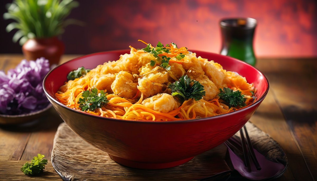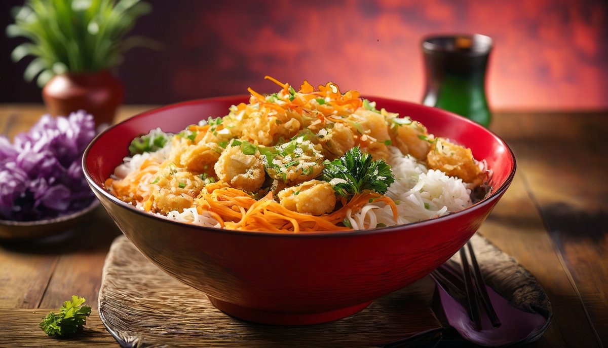 ბრინჯი, ქათმის ხორცი ტემპურაში, მწვანე ხახვი, მწვანე ბულგარული, სტაფილო, თეთრი და წითელი კომბოსტო, სეზამის მარცვლები