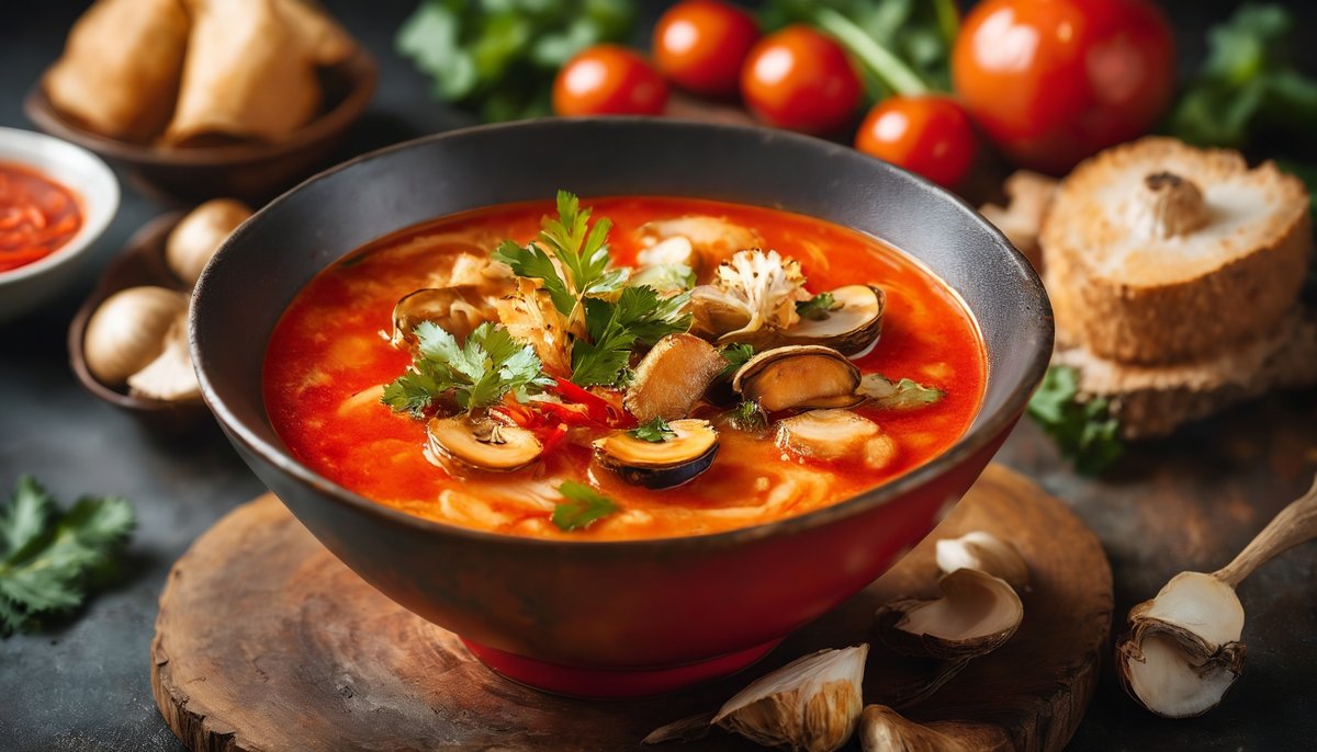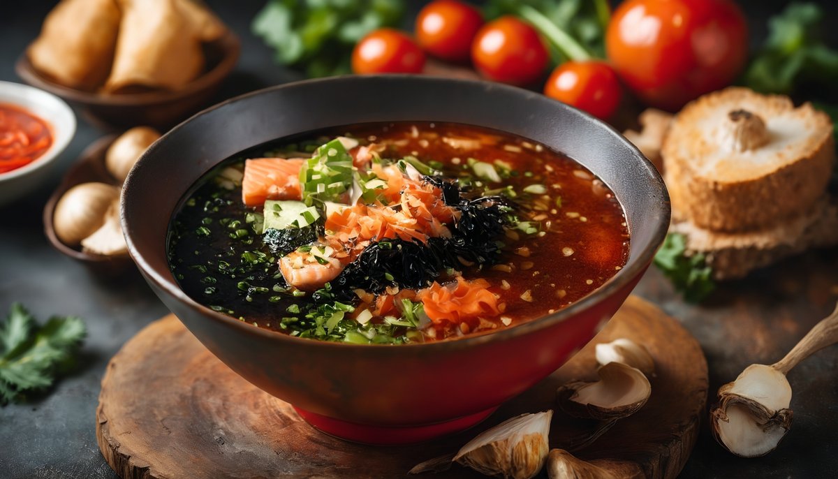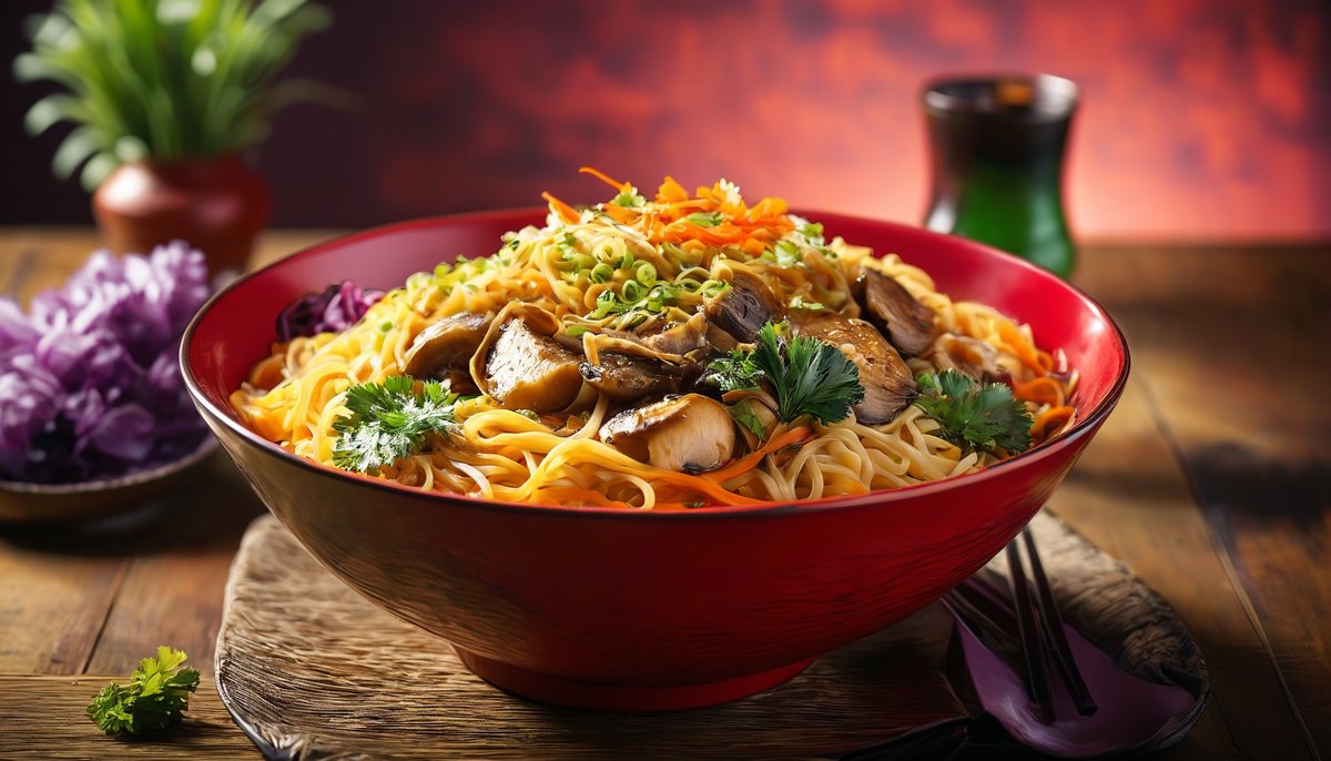 ნუდლსი, ქამა სოკო, მწვანე ხახვი, სტაფილო, მწვანე ბულგარული, წითელი და თეთრი კომბოსტო, სეზამის მარცვლები