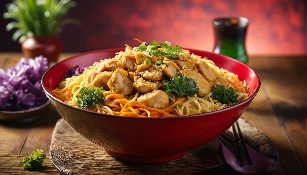 ნუდლსი, ქათმის ხორცი, მწვანე ხახვი, მწვანე ბულგარული, სტაფილო, წითელი და თეთრი კომბოსტო, სეზამის მარცვლები