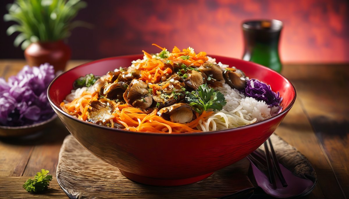 ბრინჯი, ქამა სოკო, მწვანე ხახვი, სტაფილო, მწვანე, თეთრი და წითელი კომბოსტო, სეზამის მარცვლები