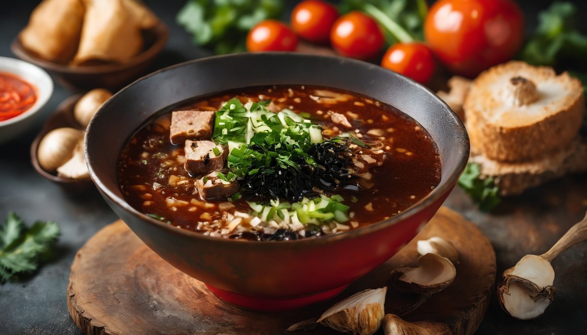 ნუდელსი, სოკო, მწვანე ხახვი, ტოფუ, ქათმის ხორცი, კვერცხი, სეზამის მარცვლები