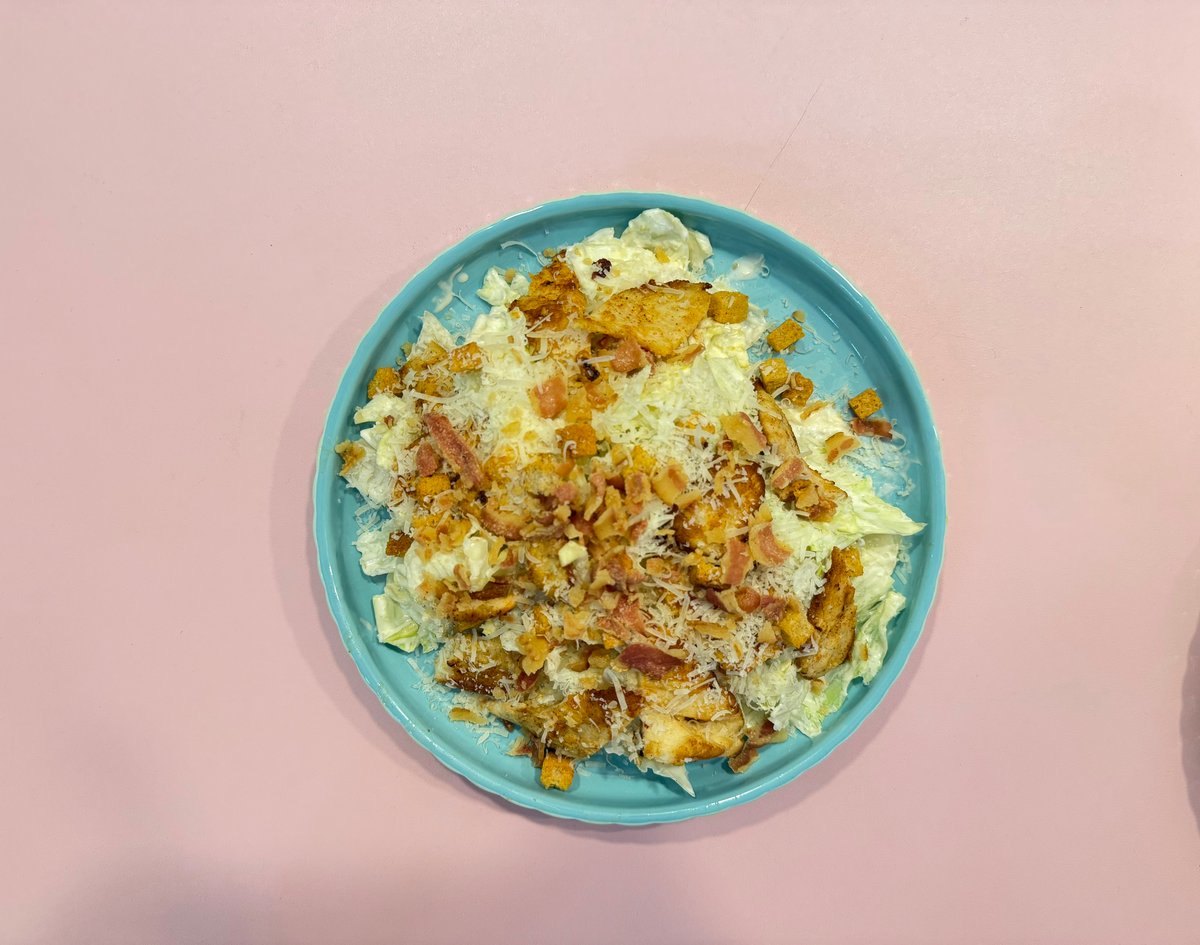 ქათმის ფილე,კვერცხი, კიტრი, პომიდორი,პარმეზანი,ავოკადო,ლურჯი ყველი,სალათის მიქსი