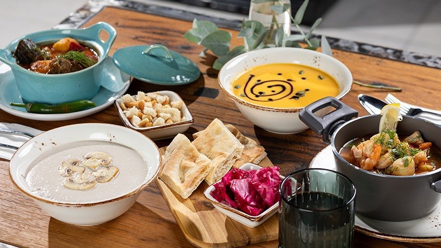 ორაგული, პიკის ქორჭილა, კრევეტები,მიდიები, კარტოფილი, ხახვი, პომიდორი, სტაფილო, სანელებლები