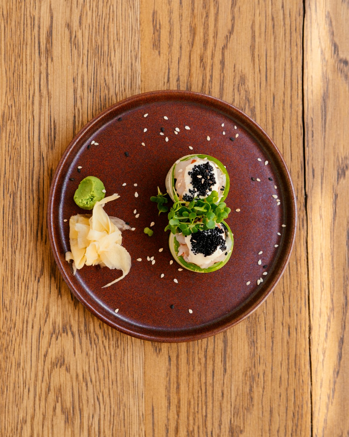 rice/eel/cucumber/cilantro / caviar /hot sauce