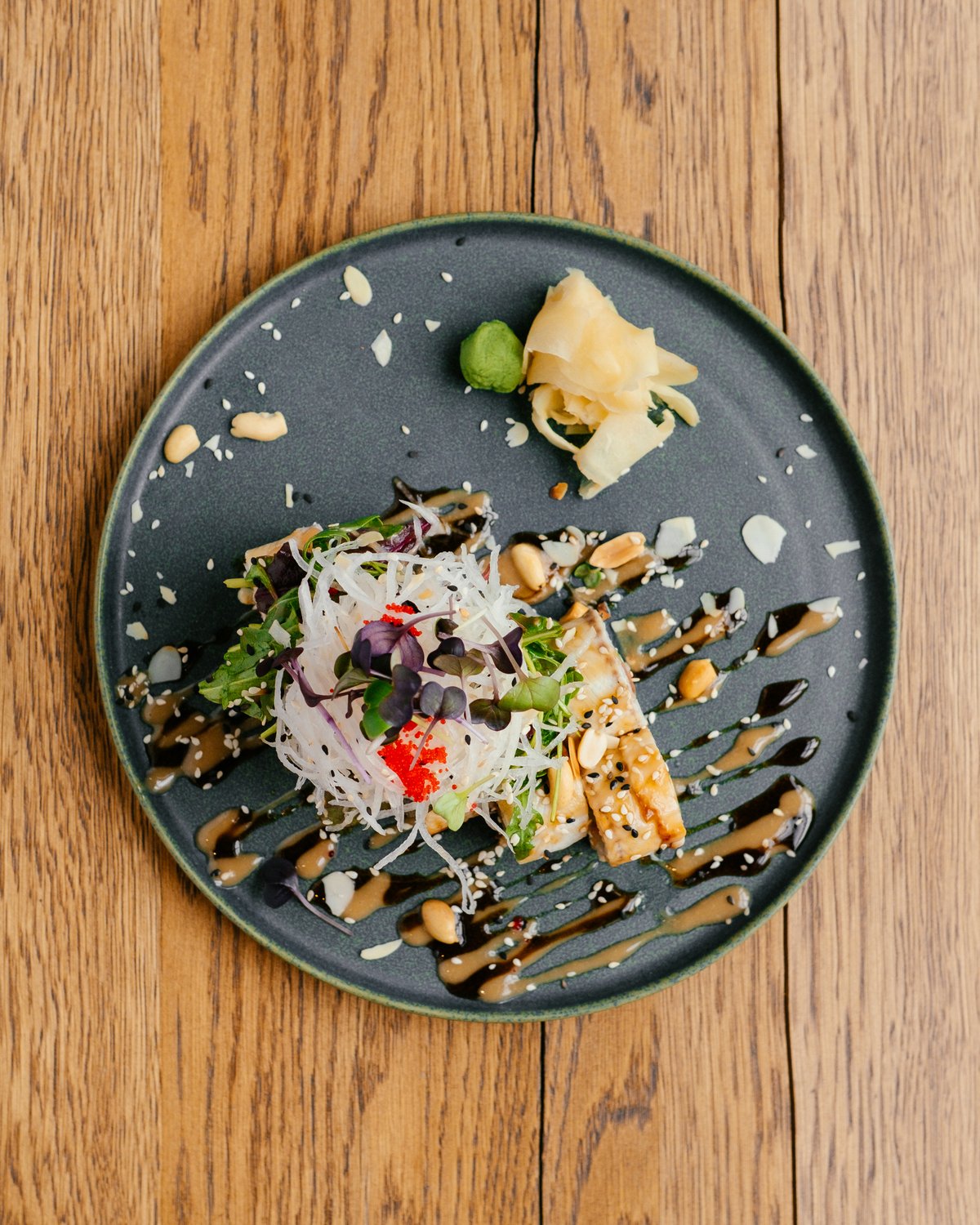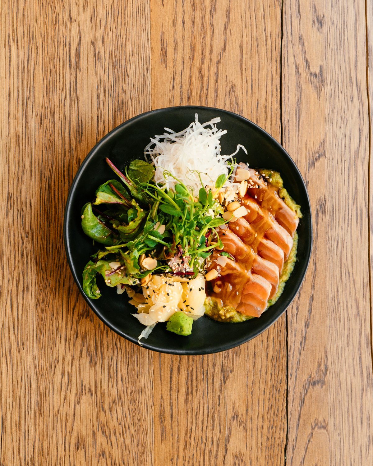 burnt tuna / guacamole / kohlrabi / salad greens / sauses / nuts