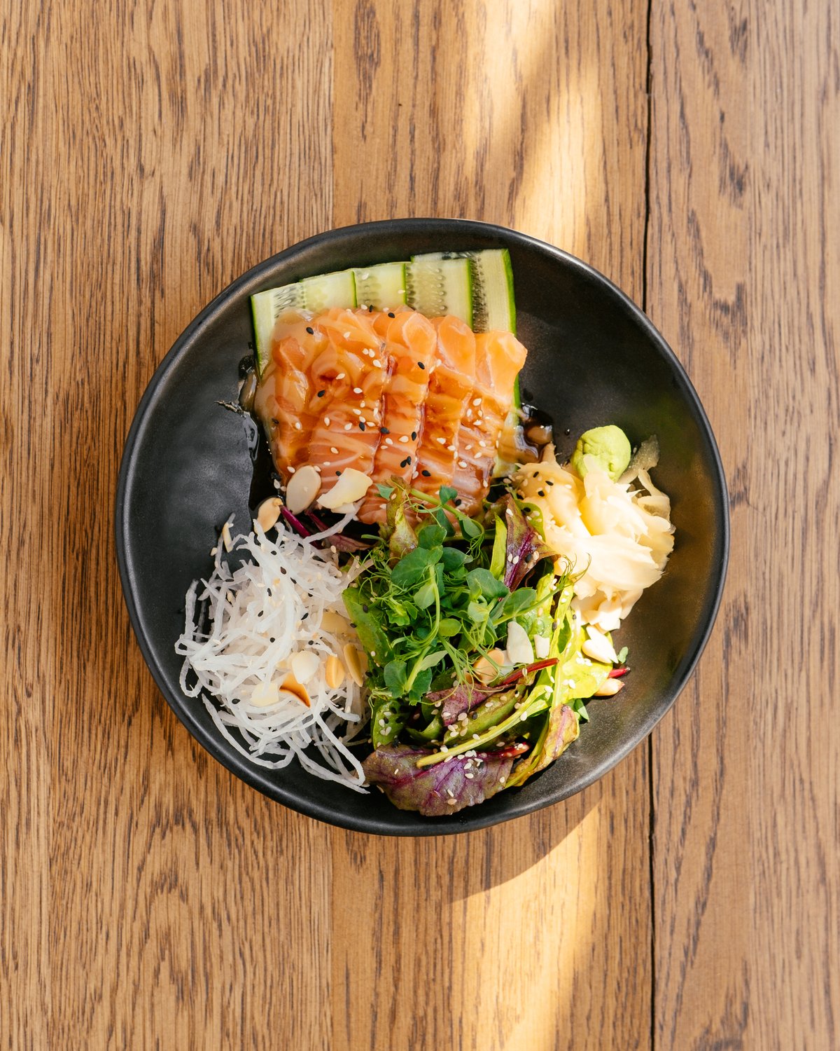 raw salmon / cucumber / kohlrabi / salad greens / sauses / nuts