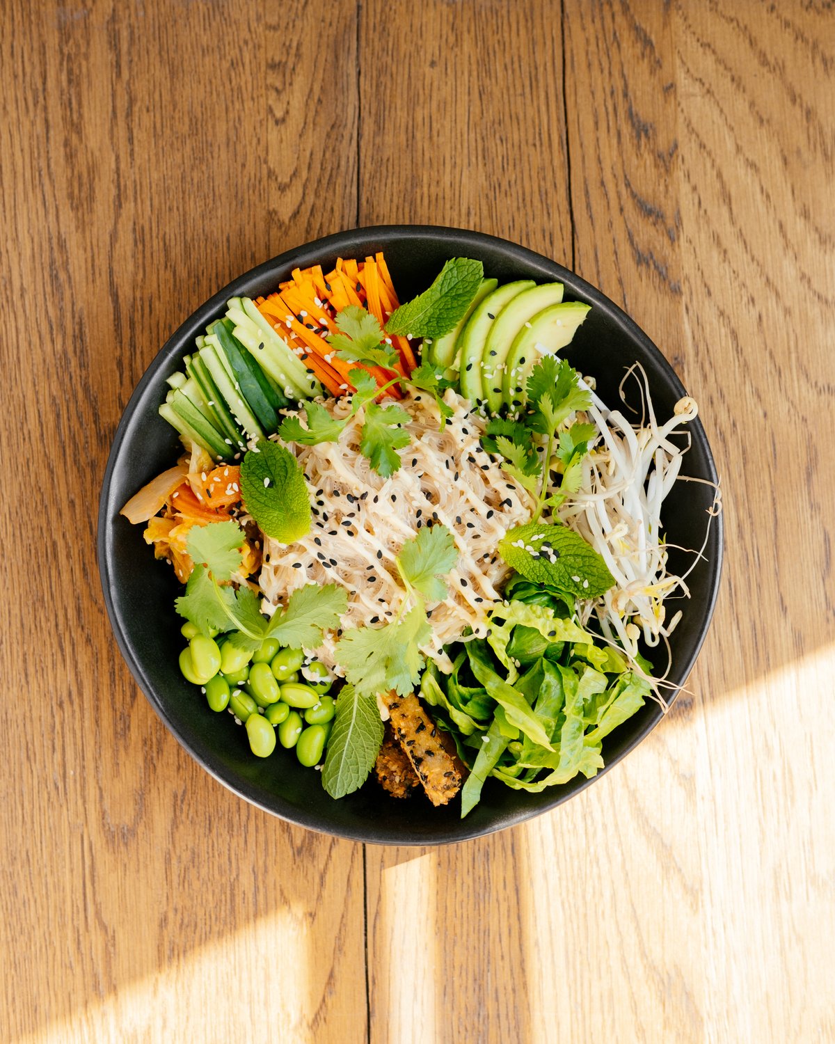 noodle /carrot / edamame / avocado / tofu / cucumber / sprouts / kimchi / coriander / lettuce