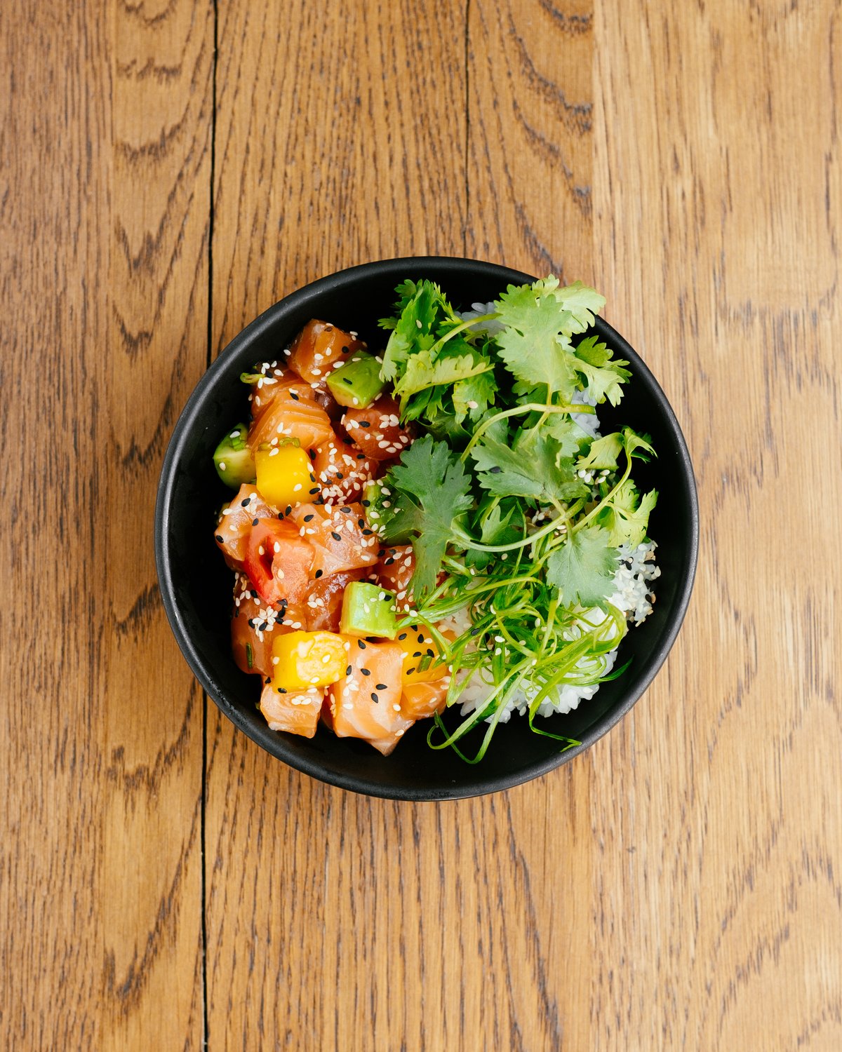 rice/salmon/mango/cilantro/ caviar /hot sauce