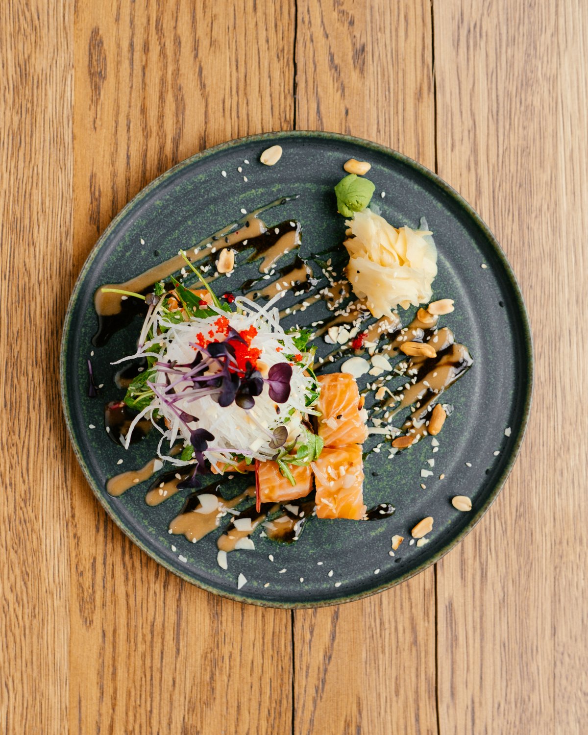 burnt salmon / guacamole / kohlrabi / salad greens / sauses / nuts