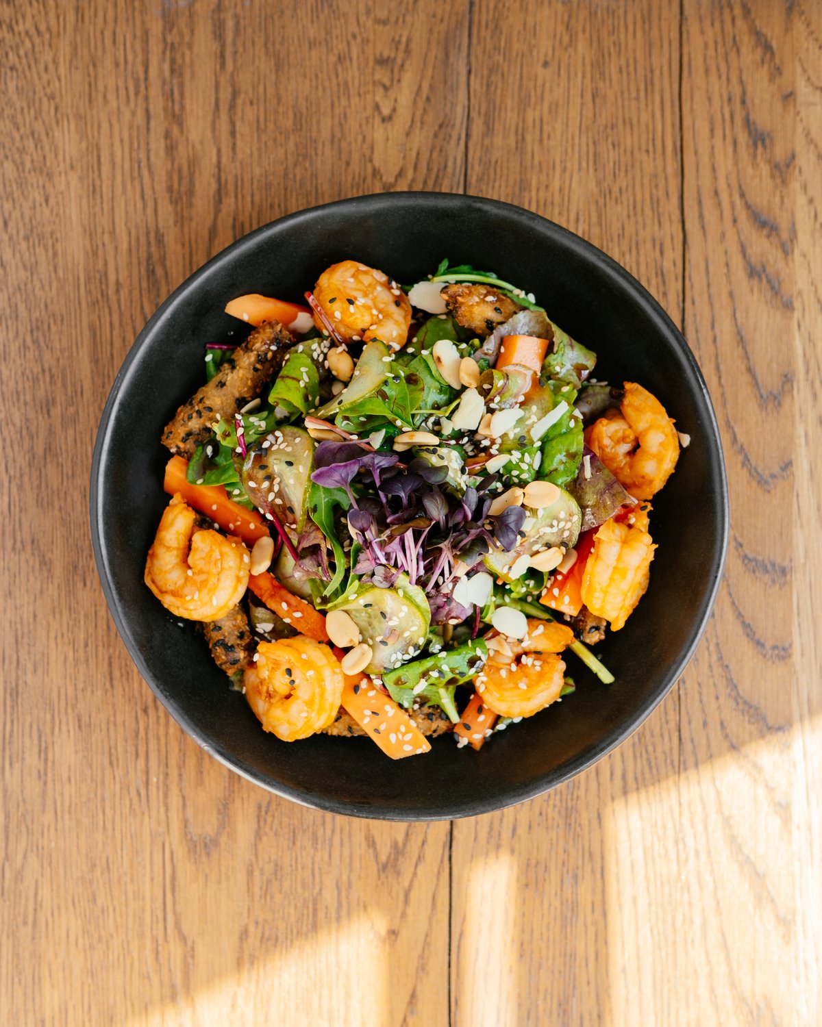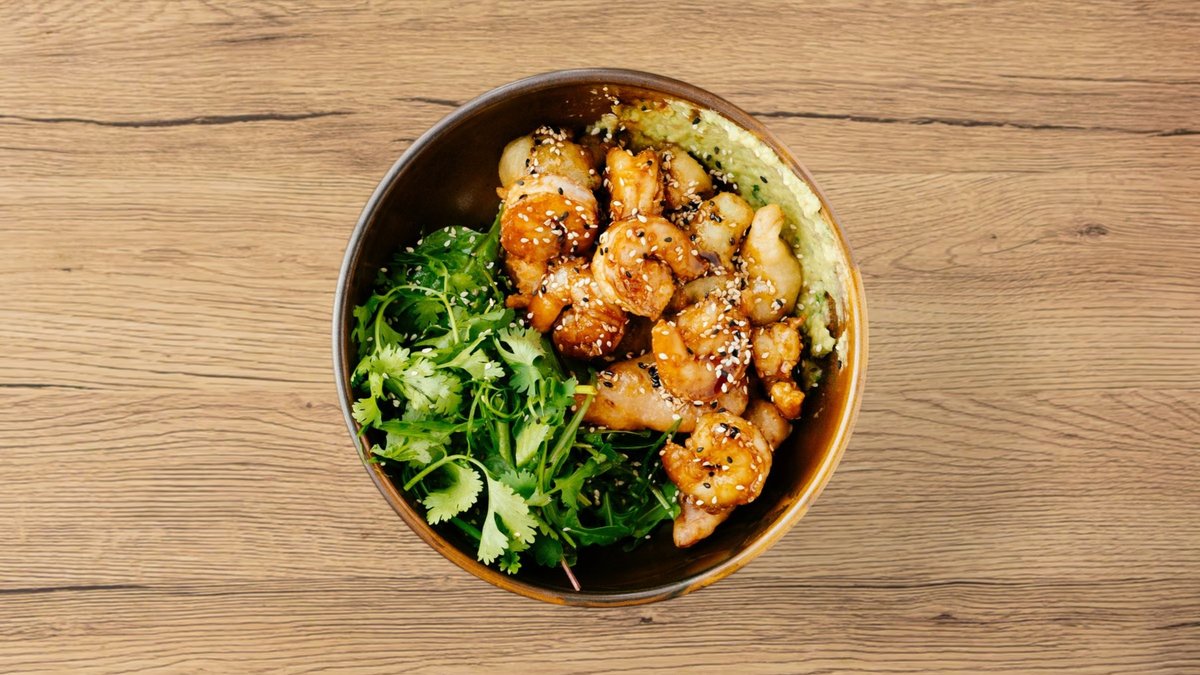 glace srimps in teriyaki sauce with vegetables, guacamole, salad greens and herbs
