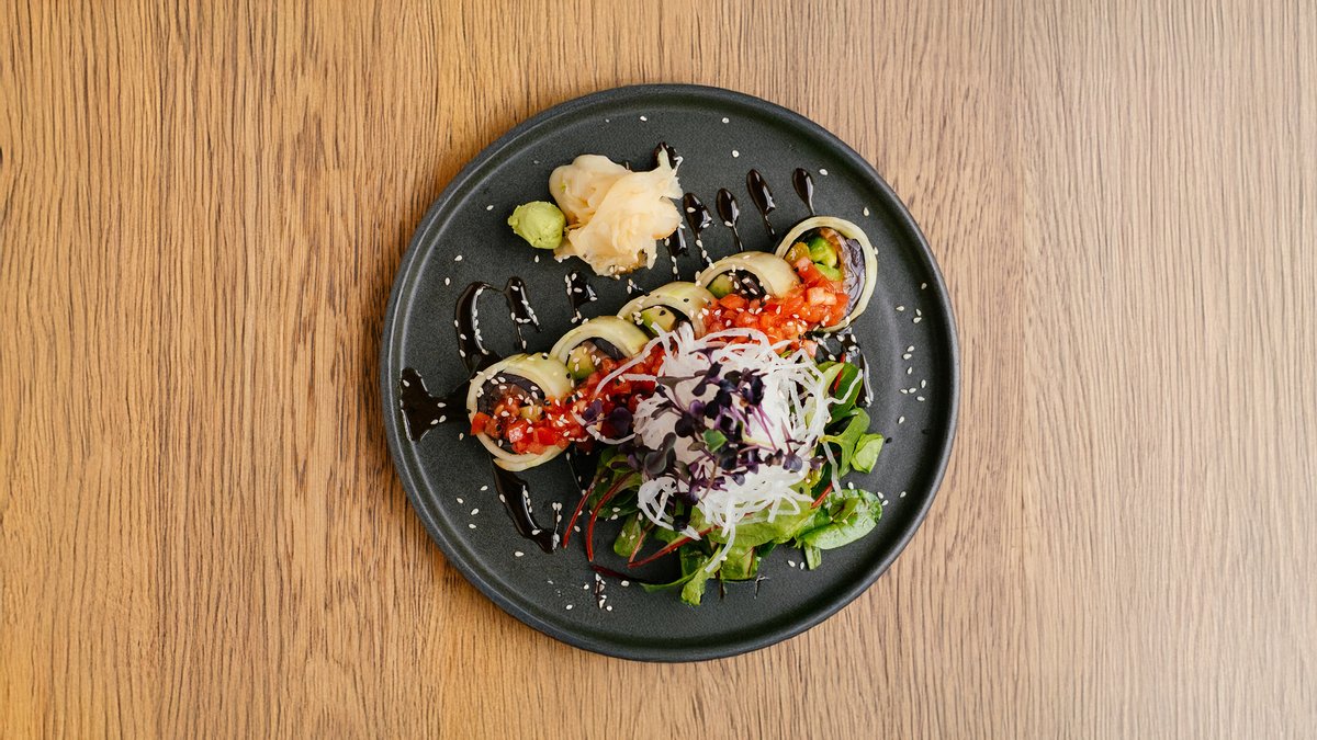 salmon / tuna / cucumber / mango / avocado / kohlrabi / salad greens / tomato salsa / sauces / without rice
