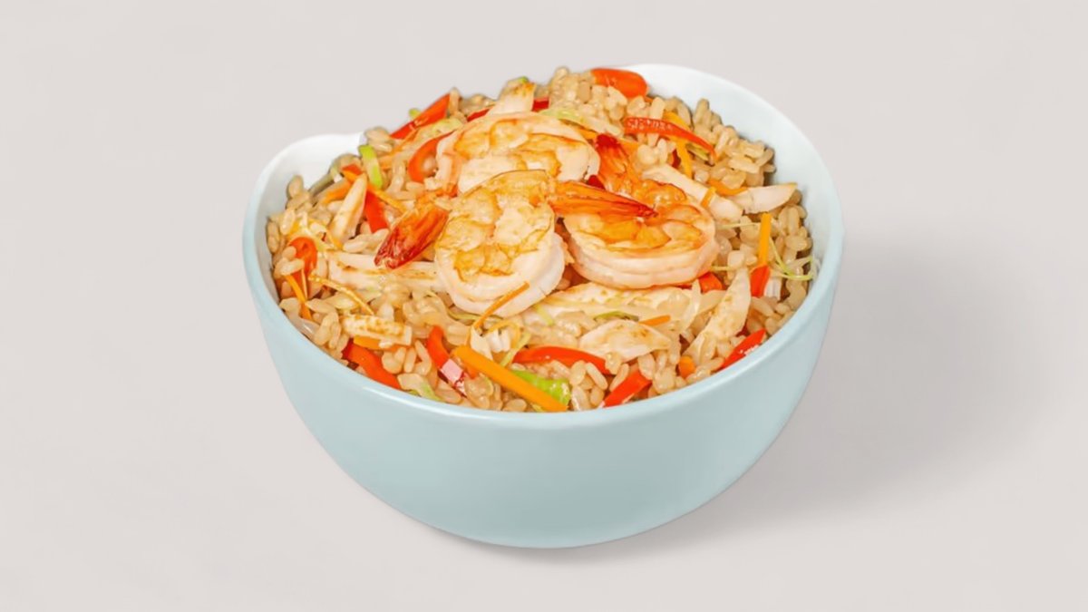Rice, Cucumber, Bell Pepper, Cherry Tomatoes, Tofu, Tiger Shrimp, Lemon, Oyster Teriyaki Sauce, Sesame 320 g Calories 466, Protein 23.07, Fat 14.61, Carbs 58.87