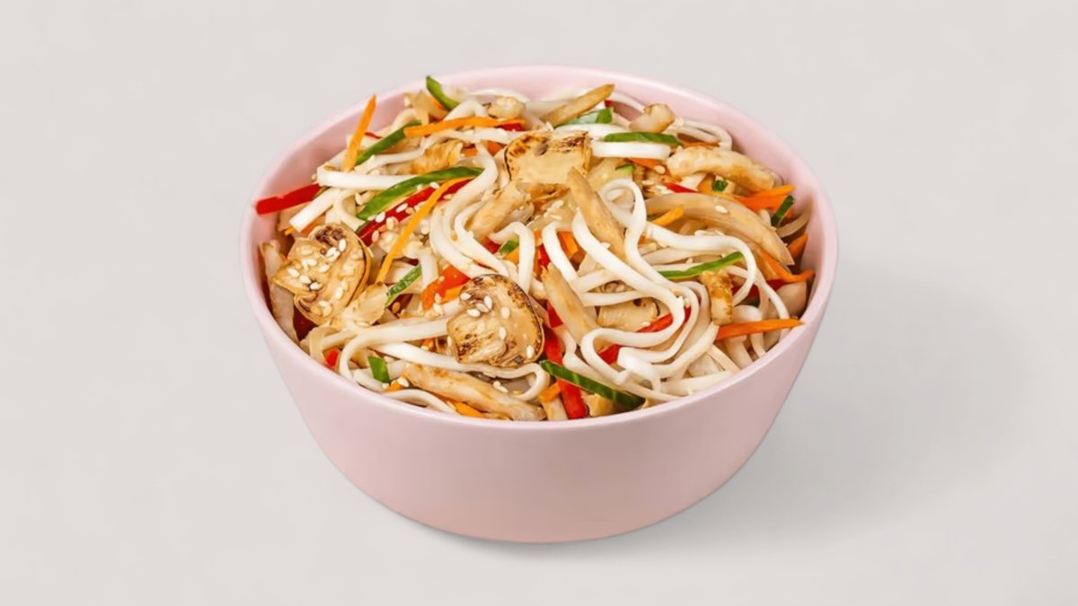 Udon Noodles, Mushrooms, Onion, Bell Pepper, Cucumber, Cabbage, Carrot, Cherry Tomatoes, Sesame, Teriyaki Sauce 225 g